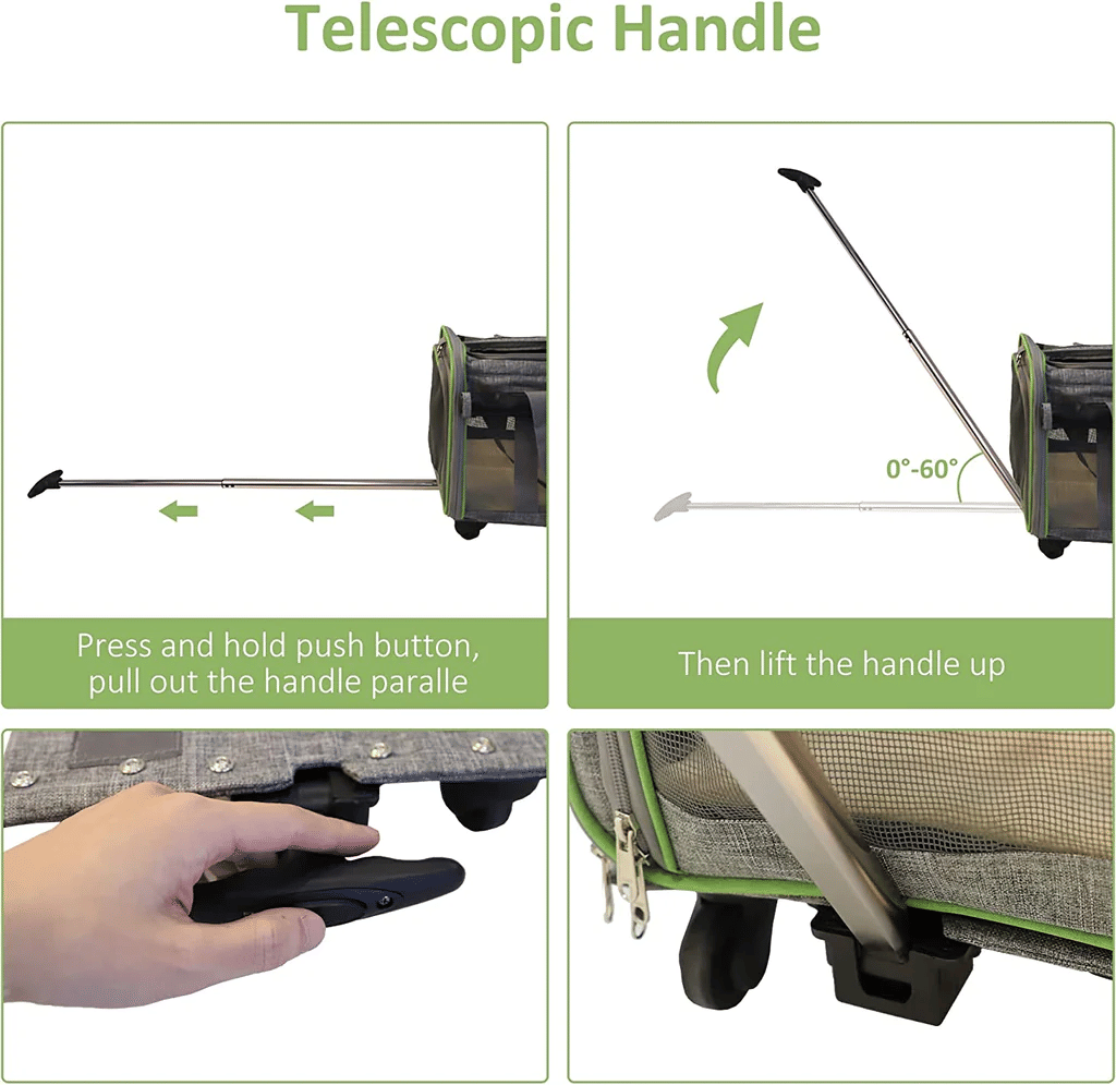 Various ways to use: with shoulder straps (with sponge pad, not hurt shoulder), removable foldable wheeled luggage cart and sponge pad wrapped hand carry. You can hang this pet air travel bag on the shoulder, handheld, or as a luggage cart pull. It can also be folded up for easy storage when not in use.