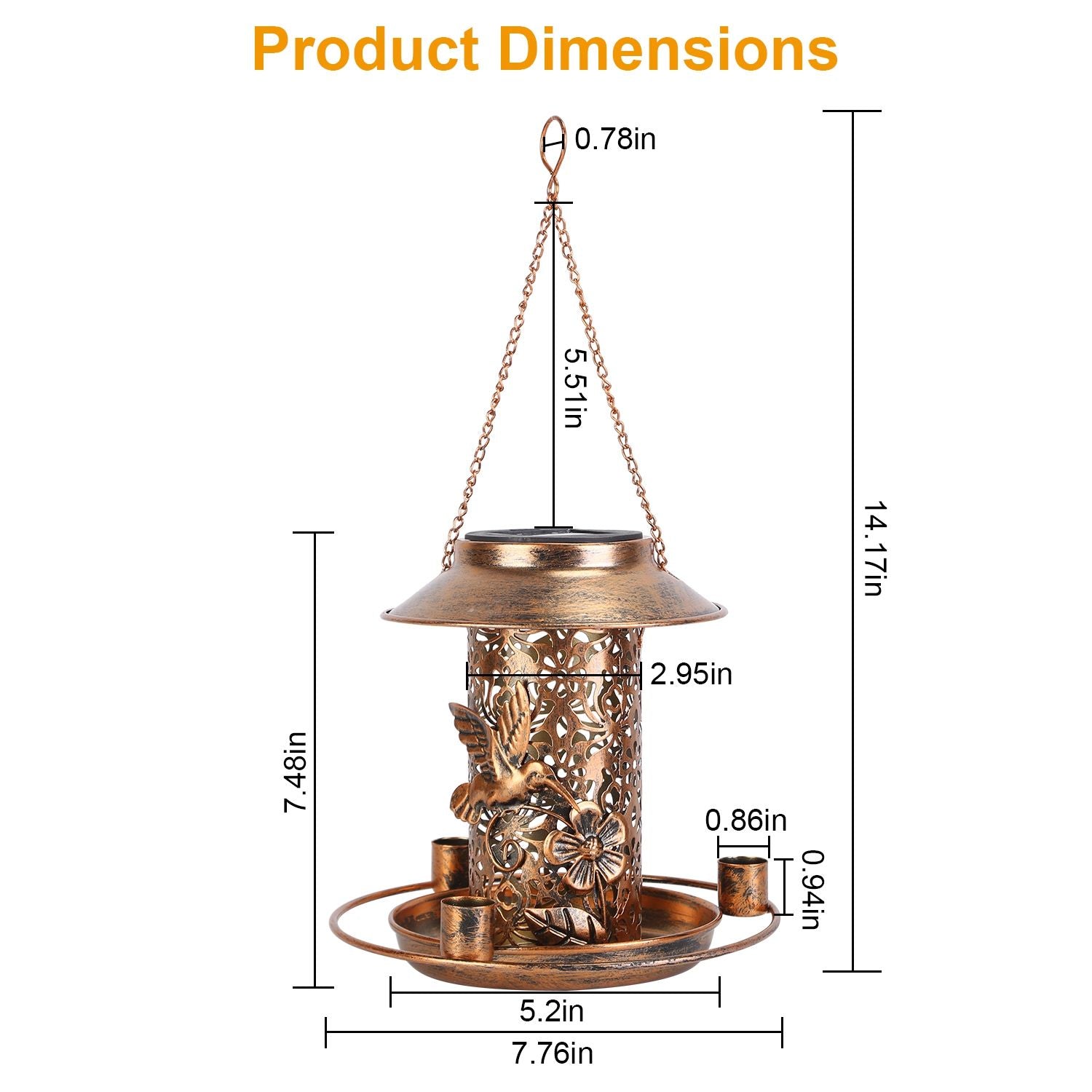 *Premium Bird Feeder*:Premium electroplating iron materials; coupled with the IP55 waterproof design; make sure it’s sturdy enough to handle most weather conditions. This hanging bird feeder is the perfect choice for any outdoor space throughout the year.