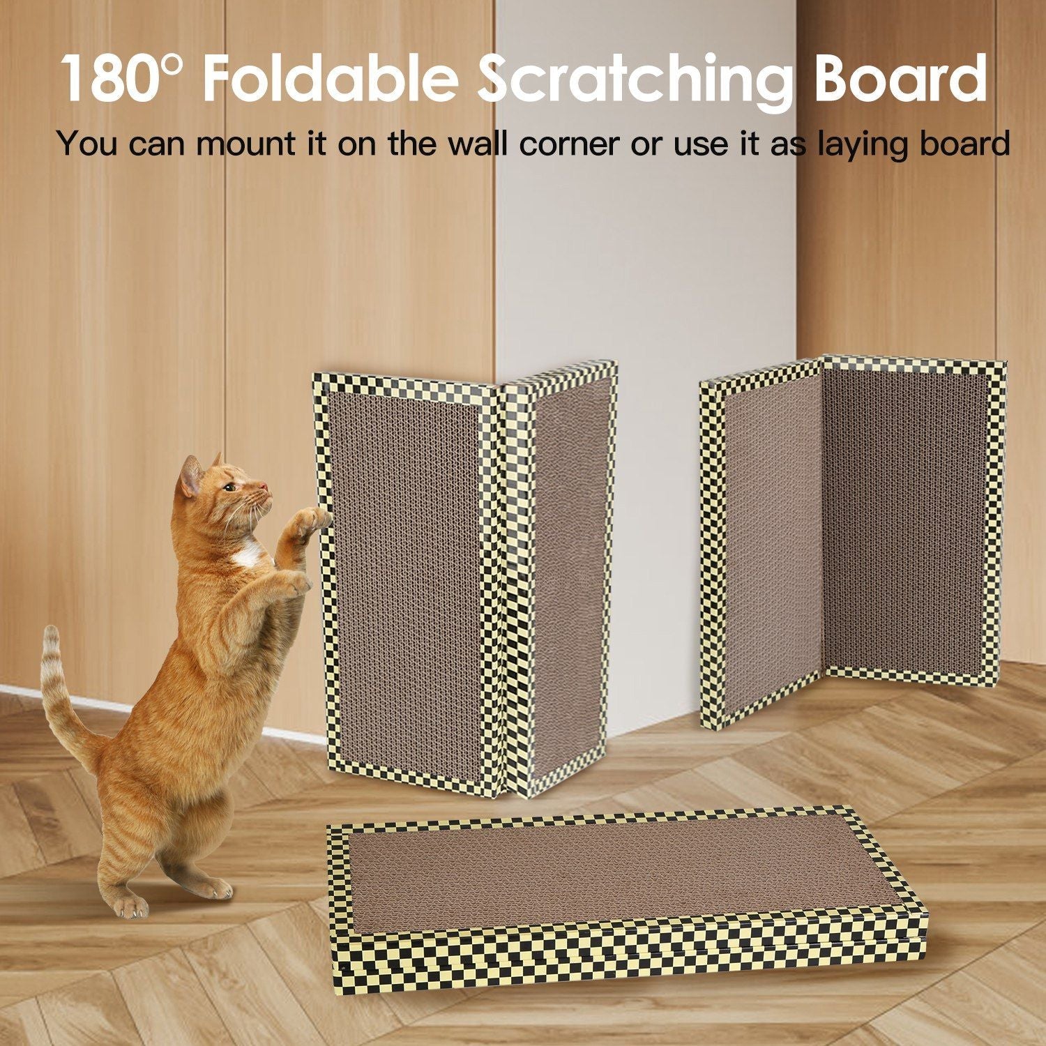 *Foldable Scratcher Board*:Unique foldable design makes this vertical corner cat scratcher can be 180° adjusted,perfectly fit for different angles of door frames,couches,cabinet corners,table legs or other furniture. Besides,you can also use the cat scratcher as a laying scratching board on floor.