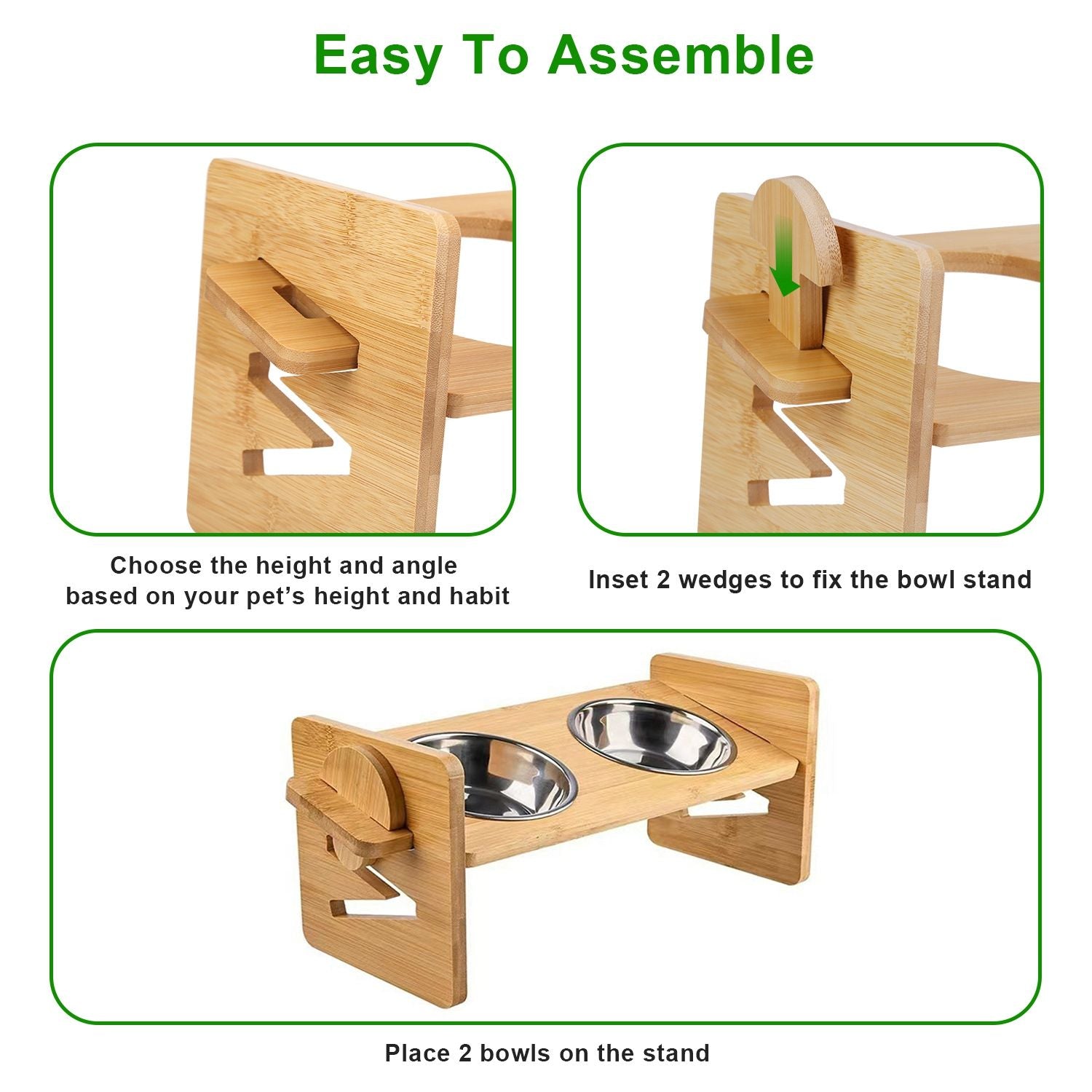 Bamboo Double Dog Raised Bowls 15 Degree Tilt Elevated Dog Bowls with 4 Adjustable Heights 2 Stainless Steel Bowls Pet Feeder for Dogs Cats Rabbits