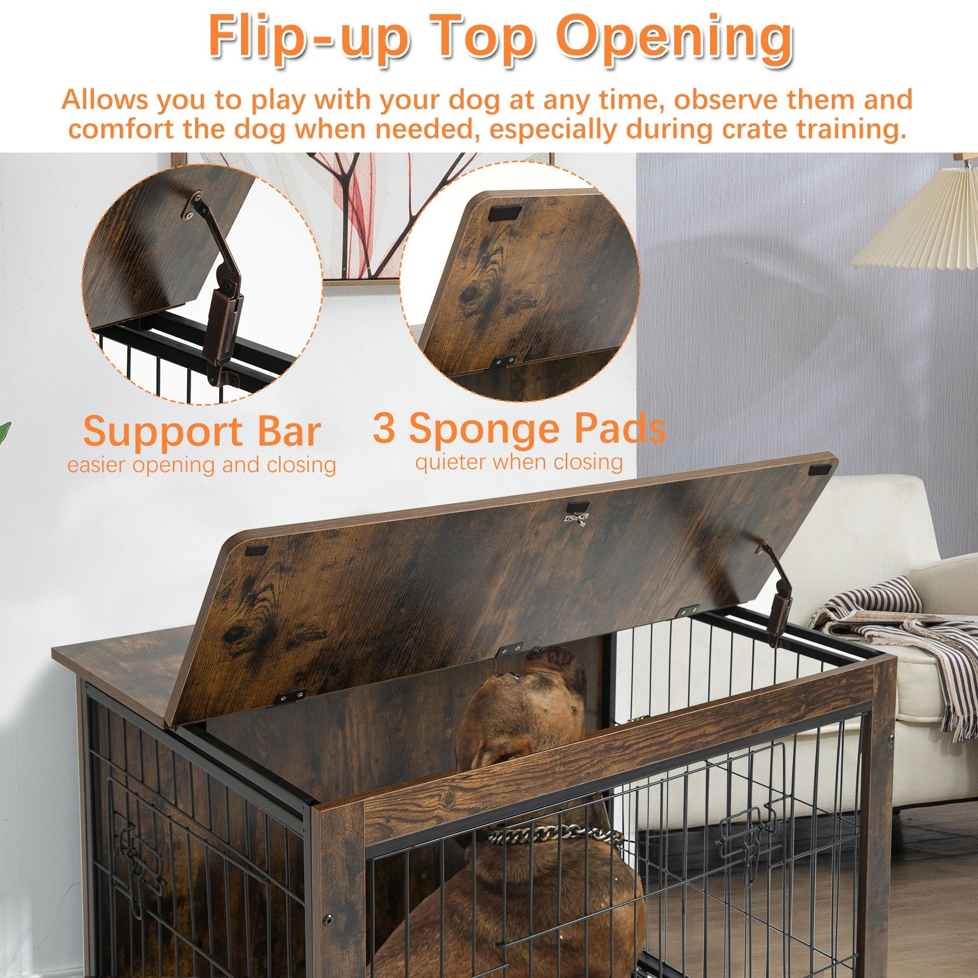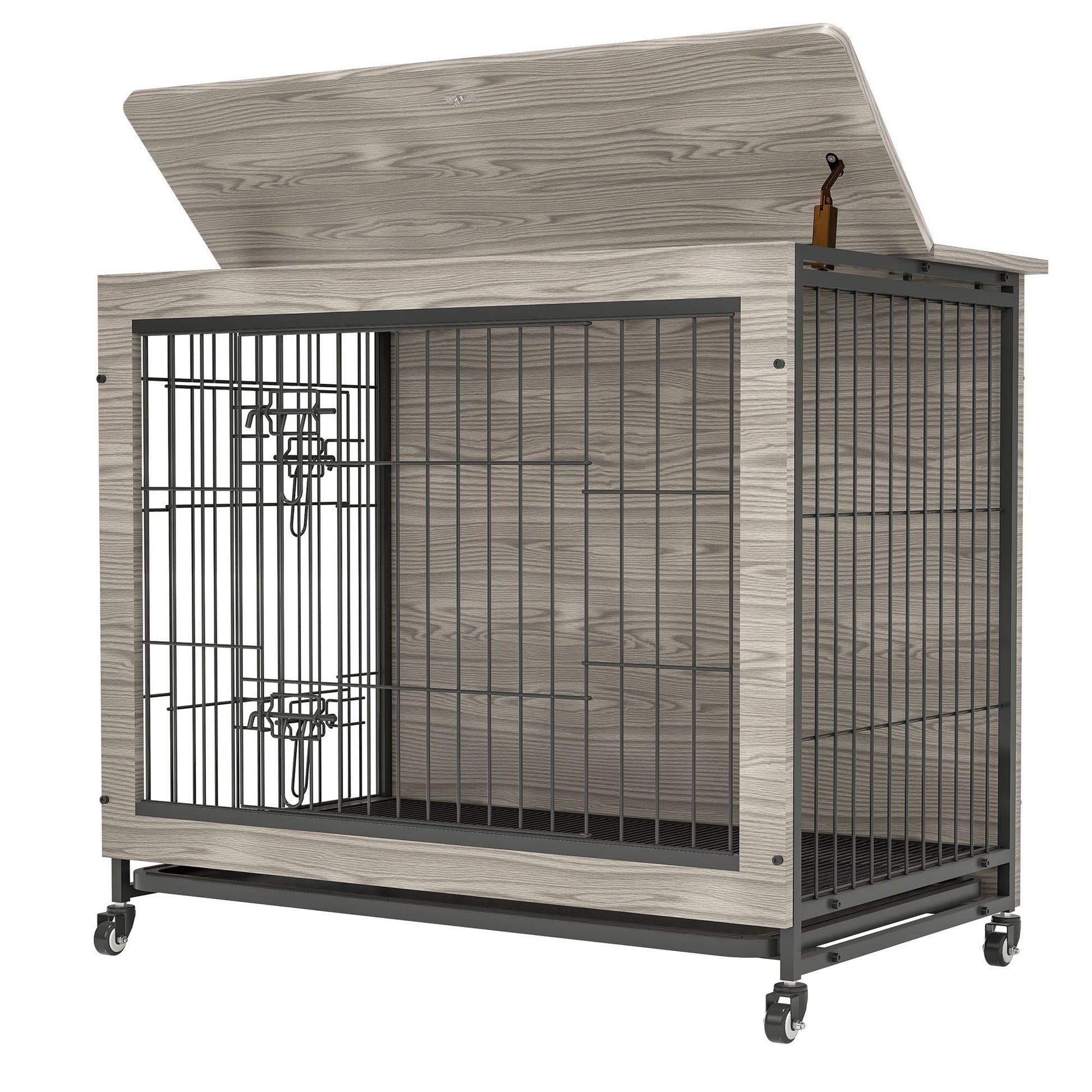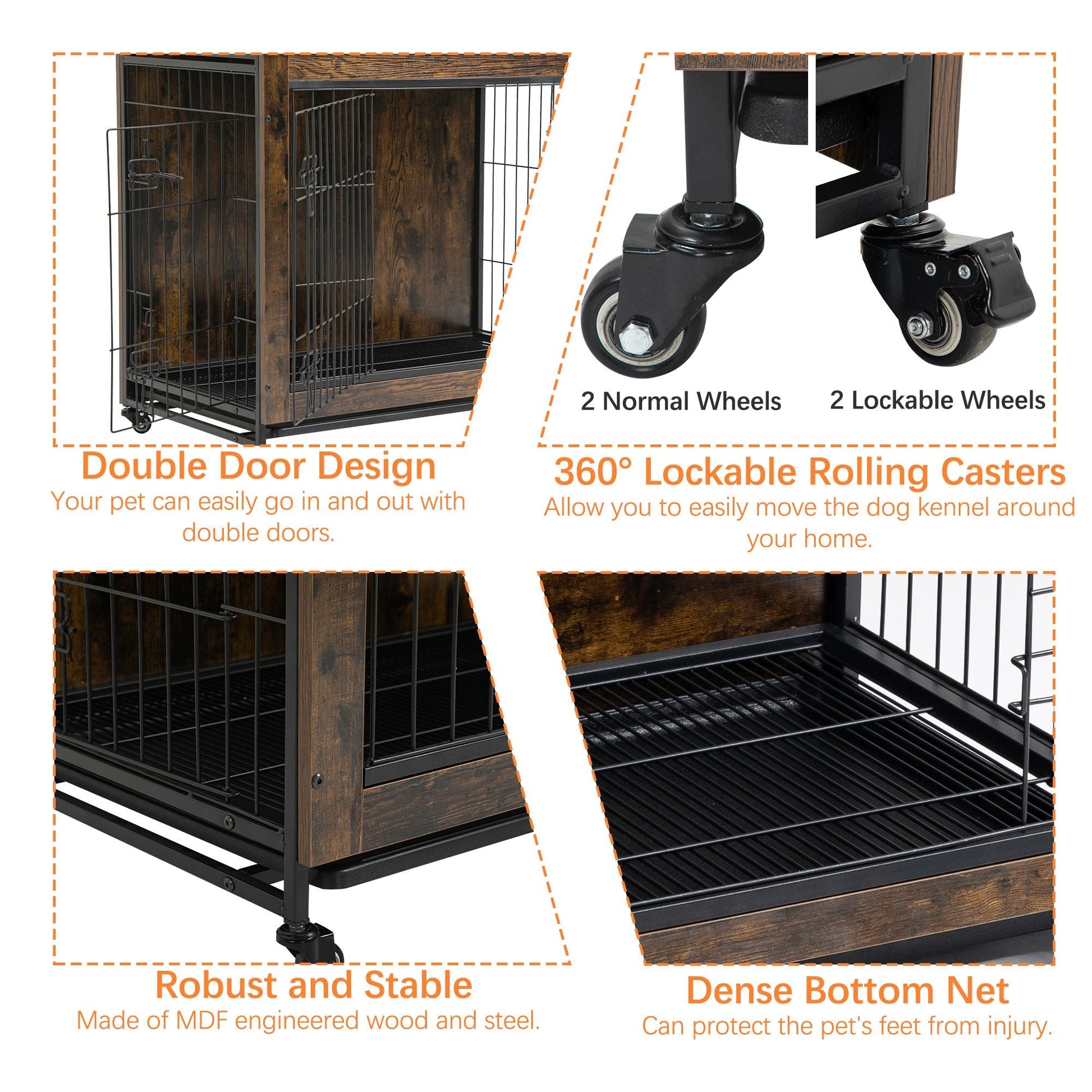 Style meets function with this versatile wooden indoor kennel that serves as a secure space for your pet as well as a practical piece of furniture that easily blends with your interior design. This heavy-duty dog crate is conveniently on rolling casters to be able to move to any room in the house. Dog cage three generously sized entry points including a wide double-door, single side-door, and horizontal lift-top provide easy accessibility. The pet crate two front-facing doors are equipped with premium latches to securely shut closed. Pet cage high-quality iron bars enclose the open-air design to allow for proper ventilation and 360 degree visibility. Give your pet a safe place to rest that doesn't obstruct your room decor thanks to this furniture-style dog pen!