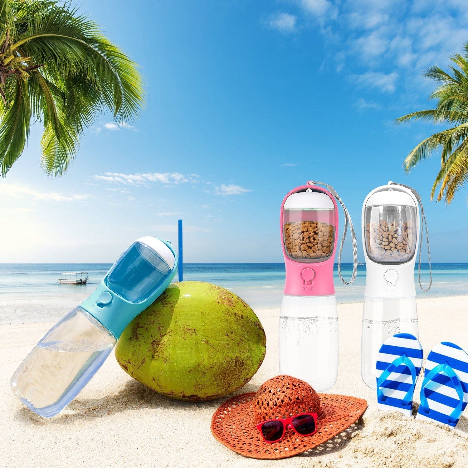 1.This 3-in-1 water bottle combines dog water bottle with water bowl and detachable food container